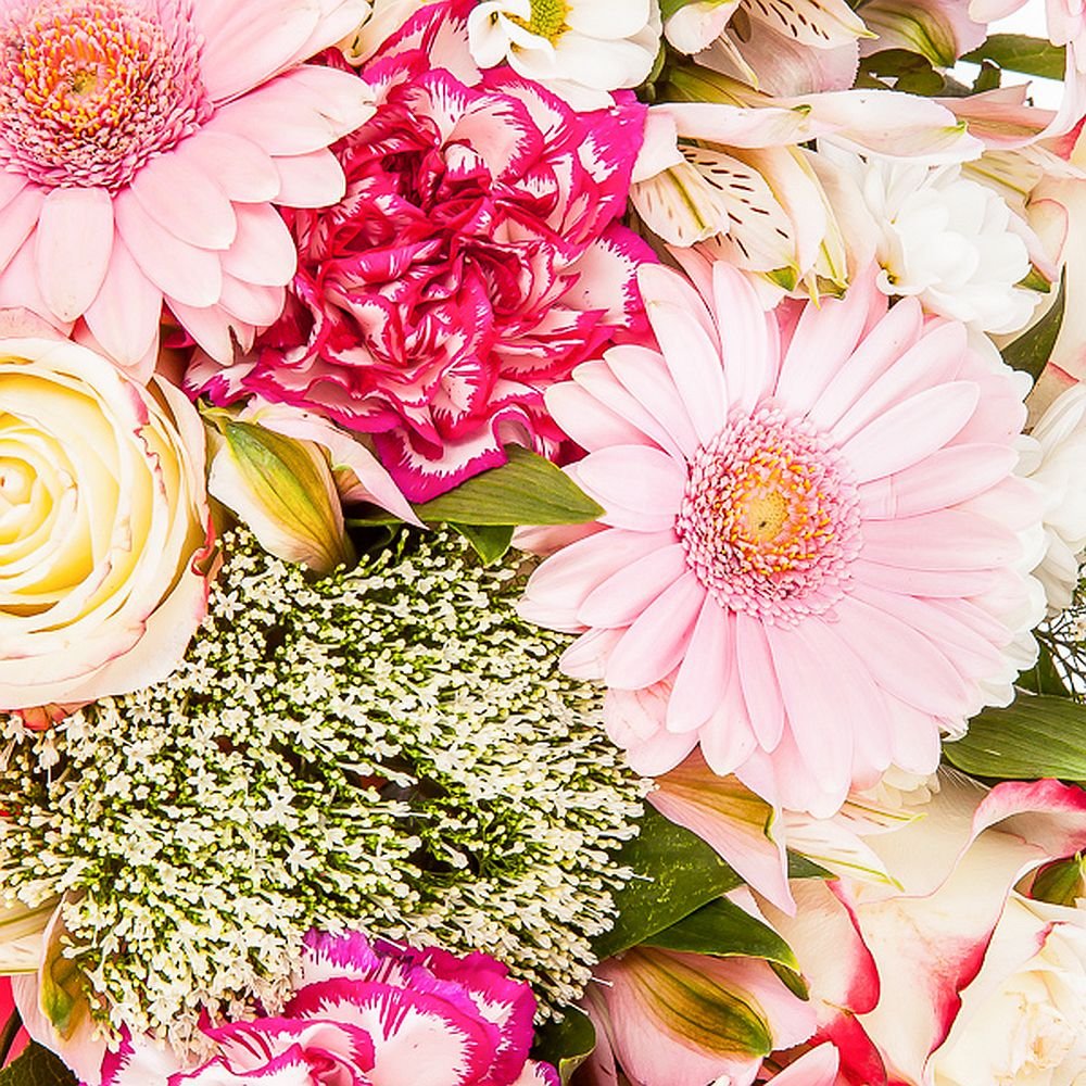 Exkluzivní 7 ks karafiát, 7 ks růže, 7 ks gerbera mini, 4 ks santini, 3 ks gypsophila, 4 ks alstromeria, manžeta, mašle a dekorativní zeleň (italský ruscus, salal)